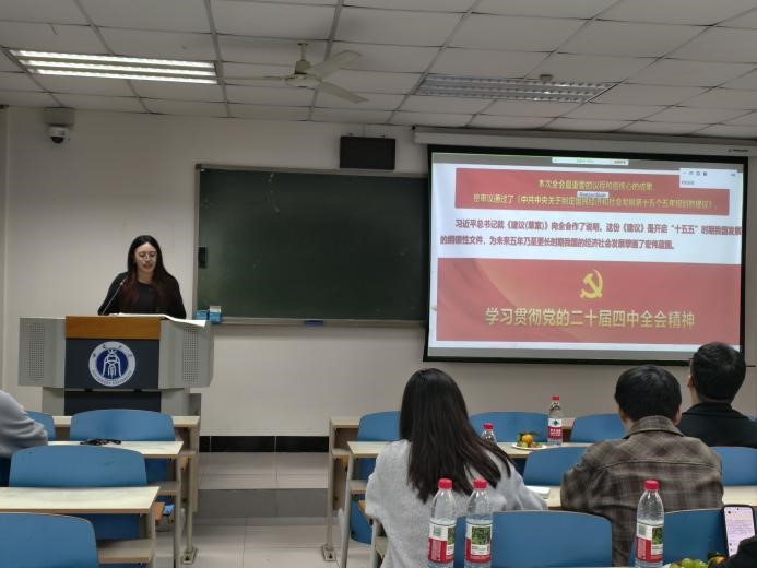 在专题学习环节,国家治理学院研究生党员邓婷围绕习近平总书记在党的二十届四中全会上的重要讲话和全会精神进行了系统领学。