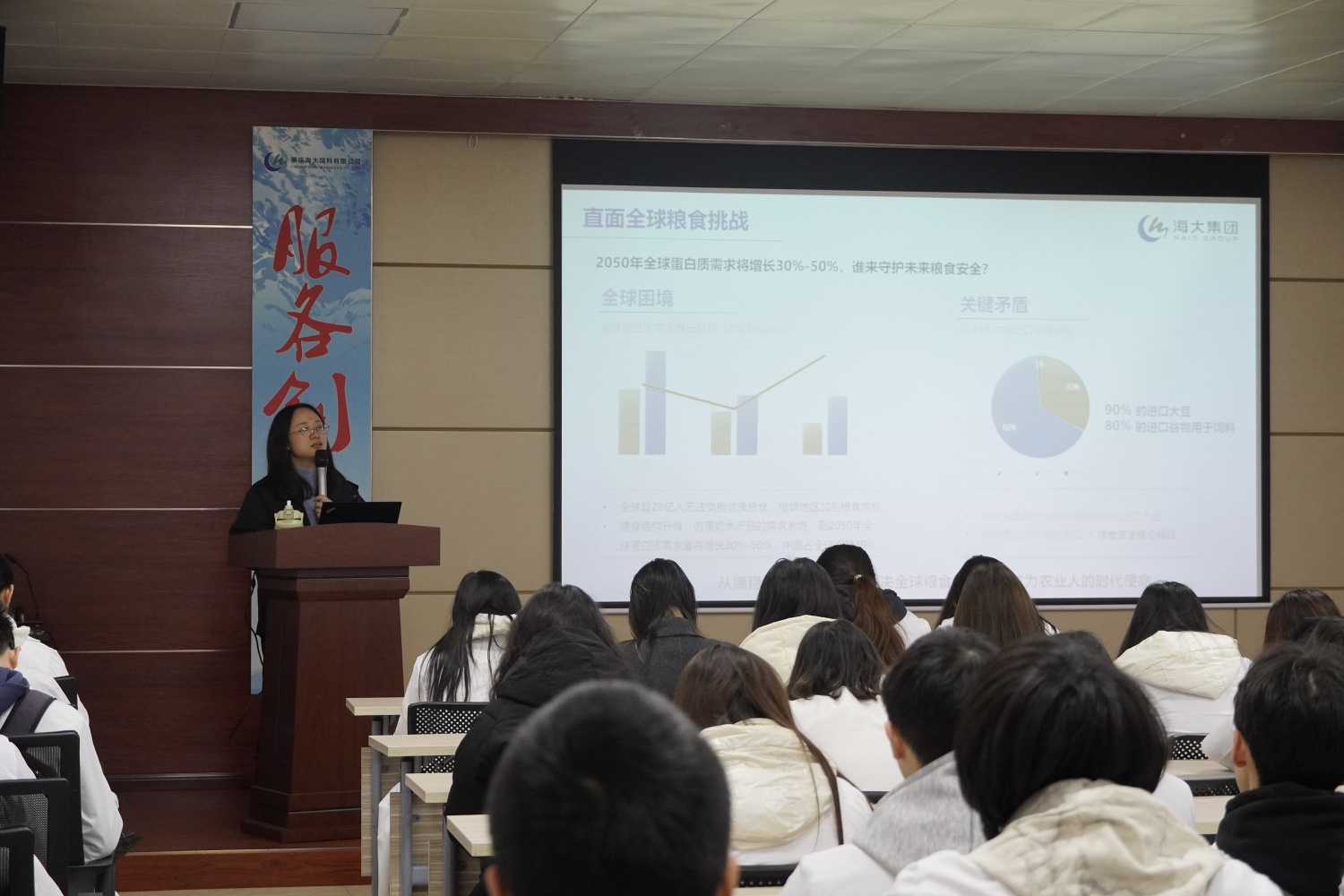 实训期间,重庆海大人事行政部经理钟小娅以“农为天下先”为主题,为同学们系统解读了海大集团的发展历程与核心文化。她从成立之初的水产预混料研发,到如今涵盖饲料、种苗、生物制药、智慧养殖等全产业链的高新农牧企业,全面展现了海大“海纳百川,有容乃大”的企业精神与“科技兴农,改变中国农村现状”的使命担当。钟小娅经理还结合行业发展趋势,分享了海大在人才培养、技术创新等方面的举措,鼓励同学们扎根农业、深耕专业,为产业兴农、乡村振兴贡献青春力量。