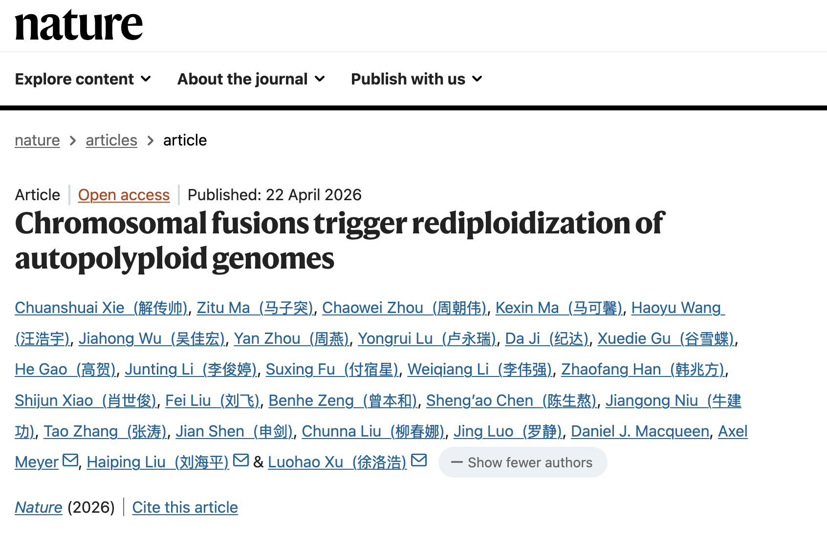 4月22日,水产学院刘海平教授、生命科学学院徐洛浩教授团队联合德国科学院院士阿克塞尔·迈尔教授团队,在国际顶尖学术期刊《自然》(Nature)在线发表了最新研究论文《染色体融合触发同源多倍体基因组的再二倍化》(Chromosomal fusions trigger rediploidization of autopolyploid genomes),系统揭示了脊椎动物全基因组复制后发生“再二倍化”的关键演化机制。